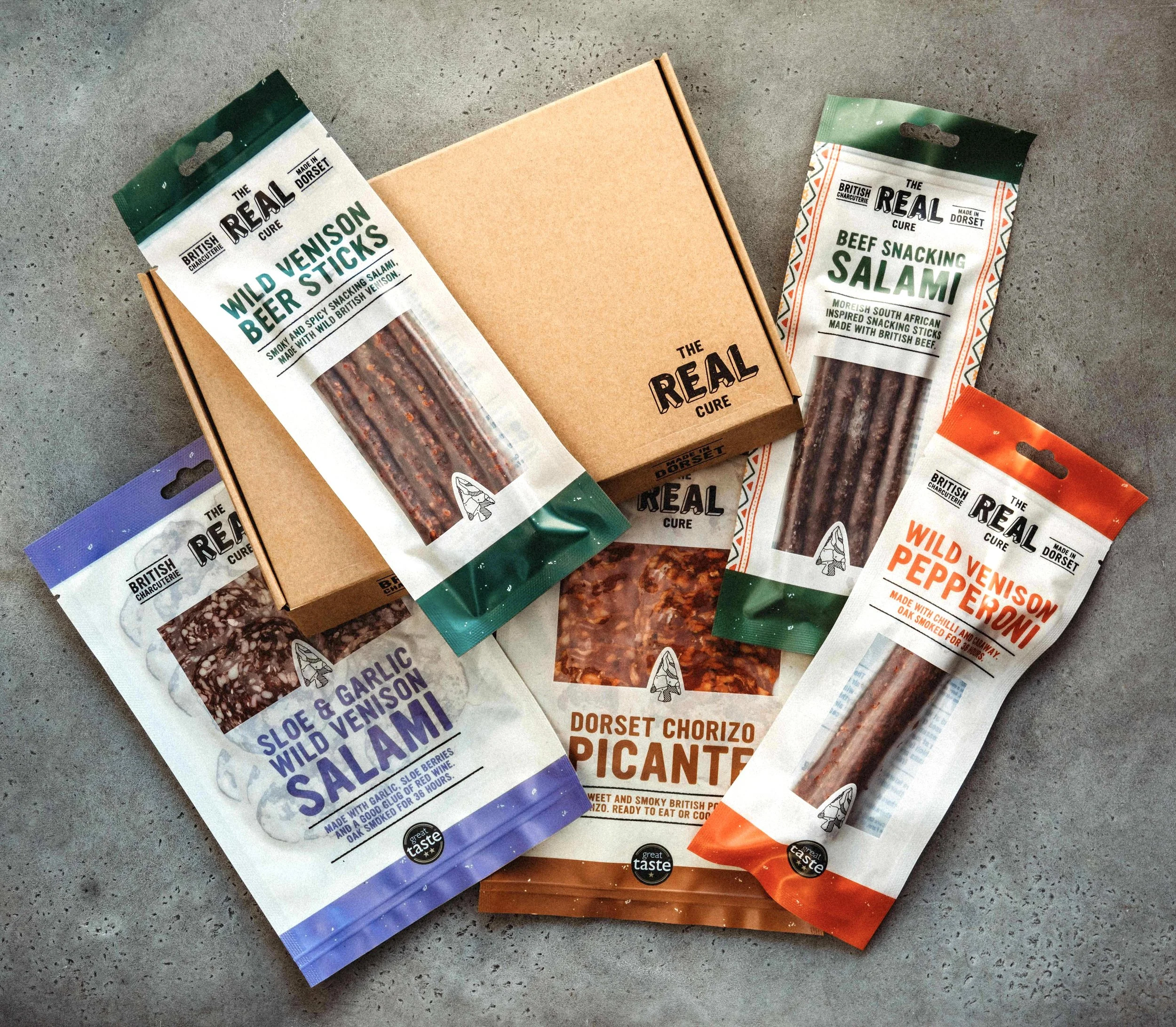 We’ve been awarded Great Taste stars on almost all of our products, including our Dorset Chorizo Picante, Blue Vinny & Fig Salami, Fennel & White Pepper, Dorset Nduja, Wild Venison Pepperoni, Venison Chorizo, and Sloe & Garlic Venison Salami to name a few. Here are some of our award-winning products that you can order now for home delivery.